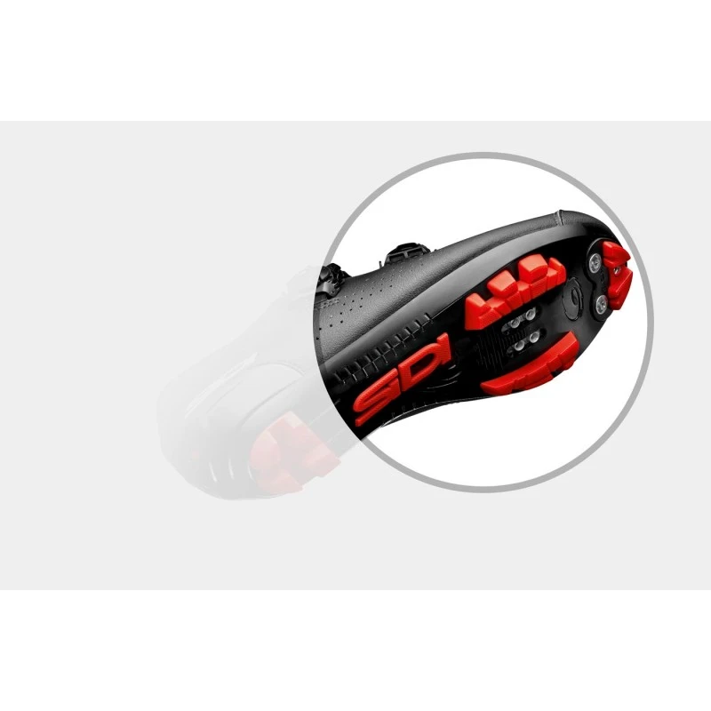 Più leggera e performante la nuova suola da mtb di Sidi è realizzata in nylon con inserti in PU. La forma degli inserti è stata studiata per il mountain bike, consente un’ottima presa, facilita la dispersione di fango e dà la giusta stabilità . L’inserto centrale contraddistinto dalla scritta Sidi funge da antiscivolo, pratico (utile) soprattutto ai meno esperti. Il puntale, zona di maggior usura (soprattutto) quando si cammina, può essere sostituito tramite delle viti ed offre sempre la possibilità di montare i ramponi per migliorare la trazione su terreni particolarmente fangosi. SR17 rappresenta il massimo risultato in termini di rigidità per la pedalata e di flessione per la camminata.